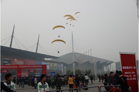 所有參展商、參觀、采購在拍照微配會動力傘