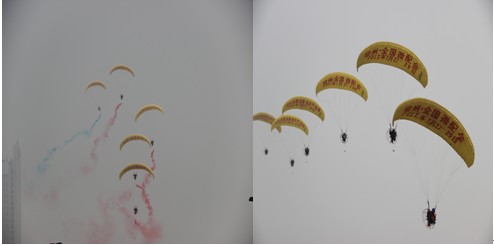 3架動力傘在汽博中心上空宣傳