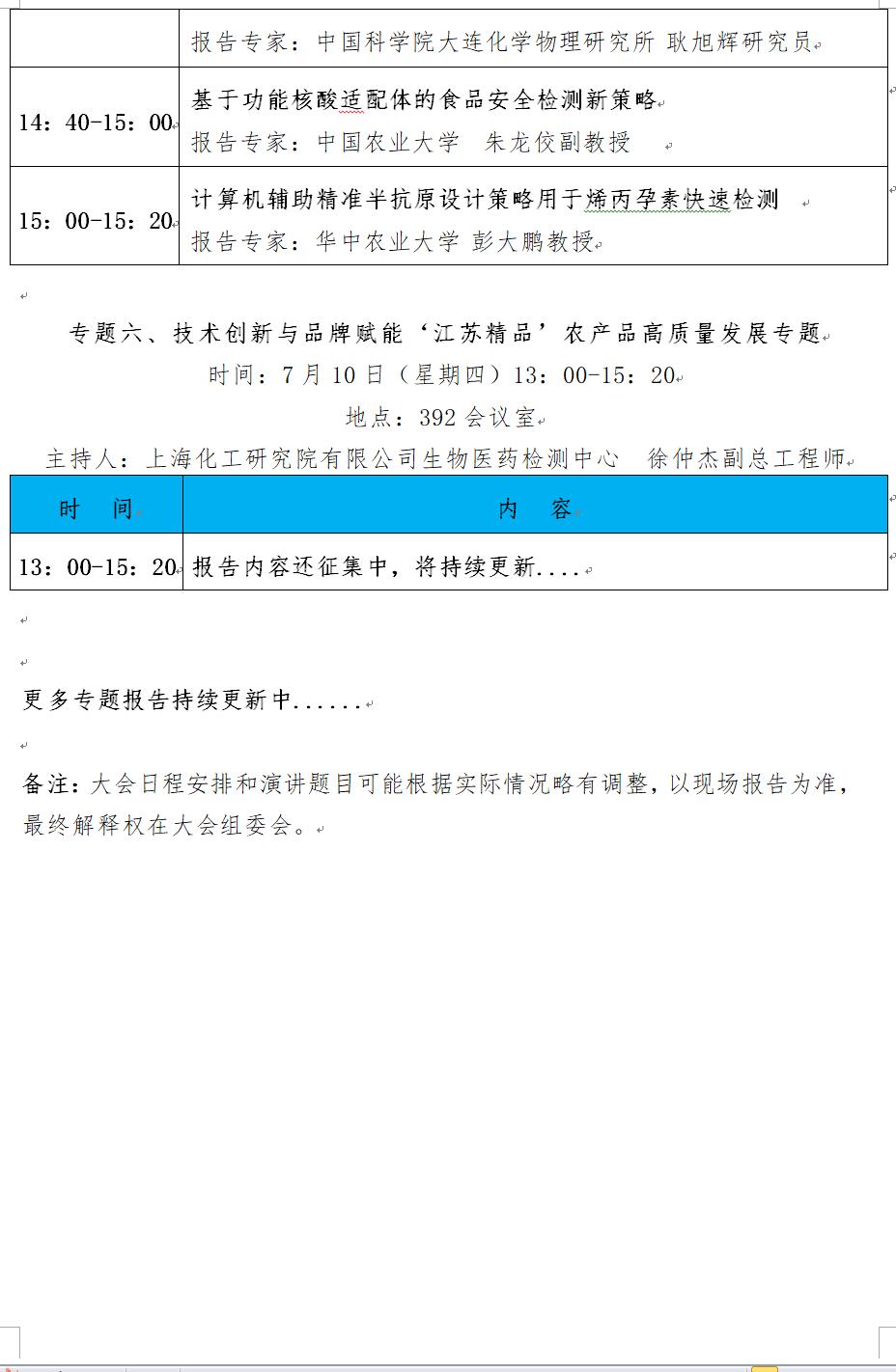 “第十四屆中國食品與農(nóng)產(chǎn)品安全檢測技術(shù)與質(zhì)量控制國際論壇”大會日程表